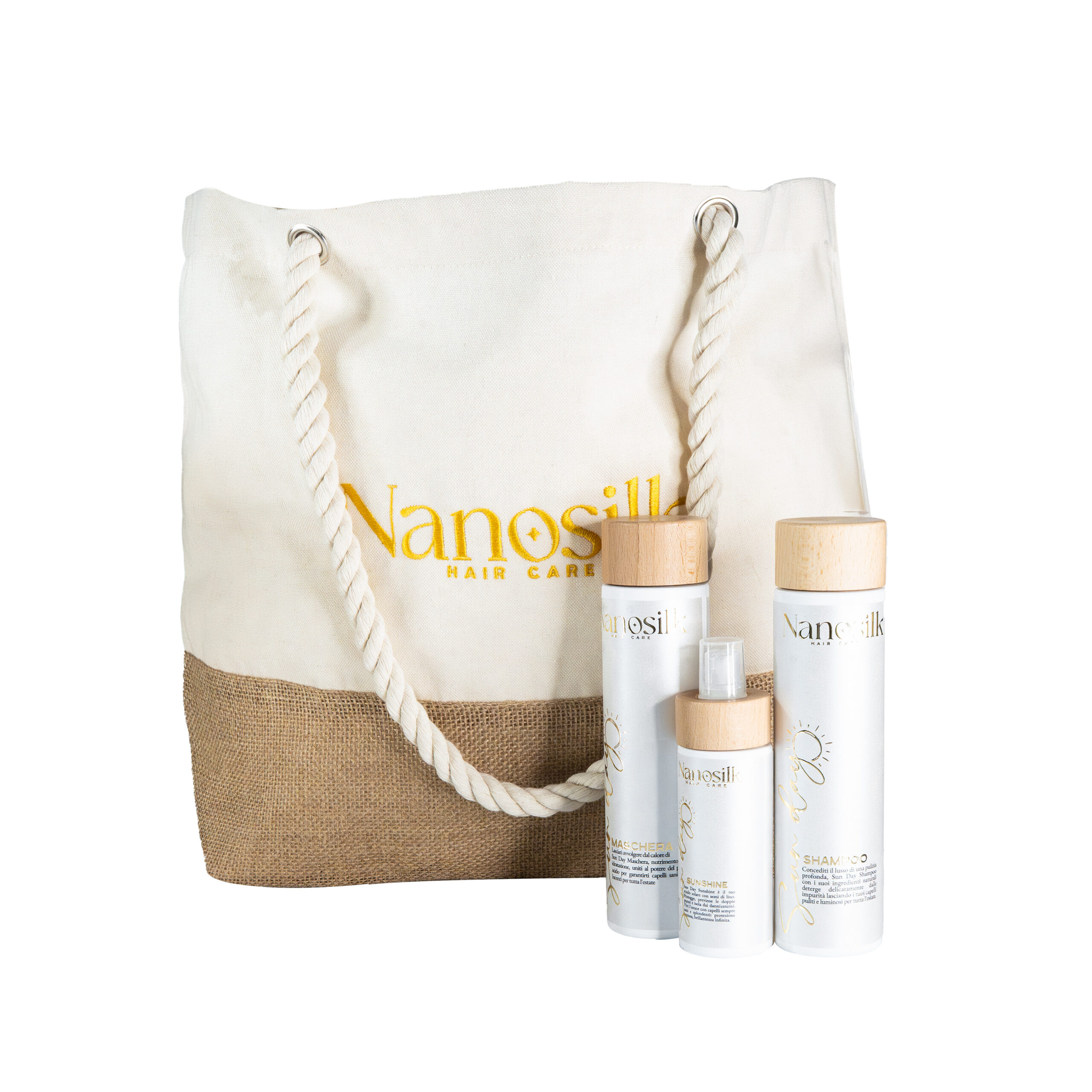 Porta con te la routine Sun Day di Nanosilk e proteggi i tuoi capelli durante tutta l’estate. La bag include shampoo e maschera 250ml, studiati per detergere, idratare e riparare i capelli esposti a sole, cloro e salsedine, lasciandoli morbidi, disciplinati e senza crespo. Perfetta anche per mantenere e prolungare i risultati della Nanoplastia.