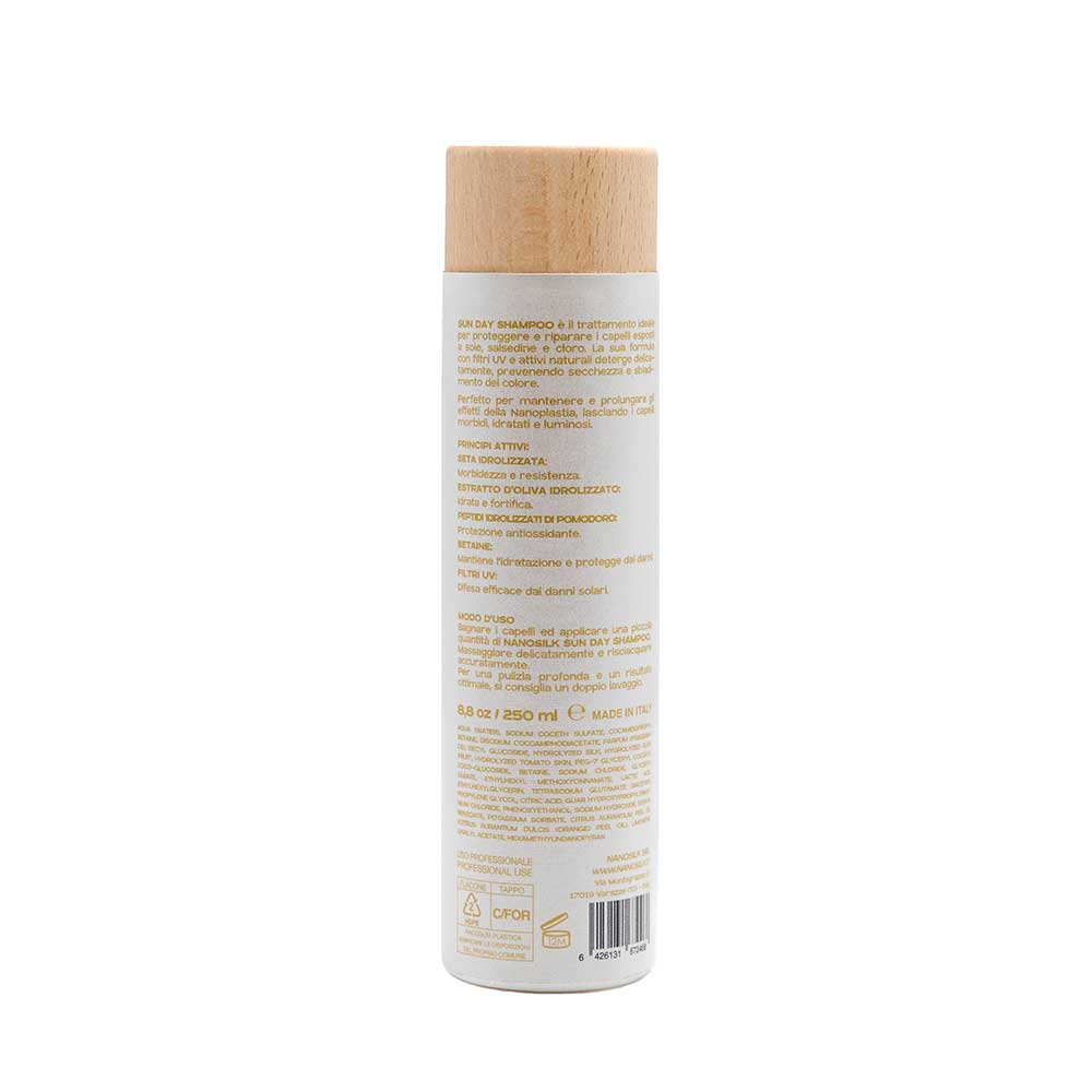 Sun Day Shampoo deterge con delicatezza i capelli esposti a sole, cloro, vento e salsedine,rimuovendo impurità e residui senza seccare il cuoio capelluto.